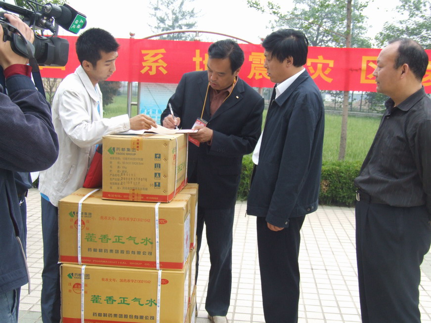2008年5月16日,开元官方网页版向四川地震灾区捐献的价值100万元的药品通过保定市红十字会发往灾区。16日上午保定市红十字会彭秘书长一行来我集团办理捐赠药品的交接手续,安国市副市长张彦安参加了交接仪式。在简短的交接仪式后,载满开元官方网页版全体员工救灾热情的药品捐赠车立即开往保定火车站。