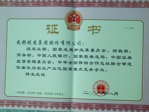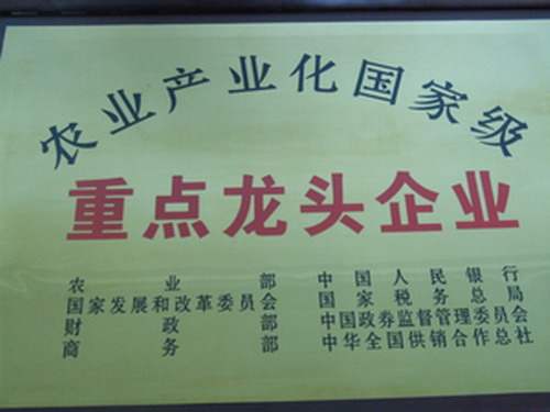 经农业部、国家发改委、财政部、商务部、中国人民银行、国家税务总局、中国证券监督管理委员会、中华全国供销合作总社联合审定,我公司被评为农业产业化国家重点龙头企业。
