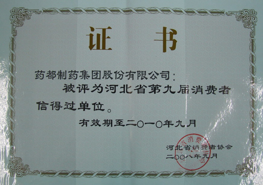 2008年九月,我公司被河北省消费者协会评为河北省第九届消费者信得过单位,此殊荣的获得,证明了我公司“药都制药,百姓用药”的服务理念得到了广大消费者的认可和青睐。