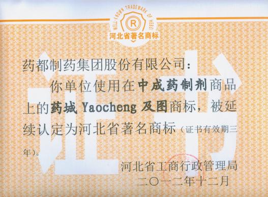 2012年12月,经河北省工商行政管理局审评,我公司“普济堂”商标、“药城”商标被延续认定为河北省著名商标。