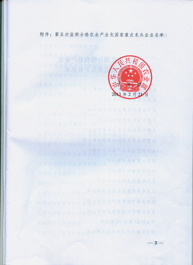 2013年2月,经全国农业产业化联席会议审定,农业产业化国家重点龙头企业第五次监测我公司被认定为合格。