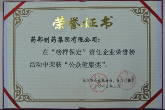 2013年3月29日,保定市工业和信息化局发布了评审结果,我公司在“榜样保定”责任企业荣誉榜活动中荣获“公众健康奖”。